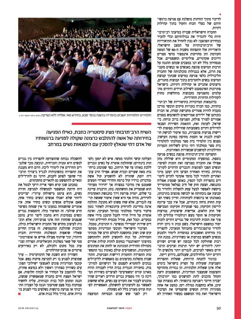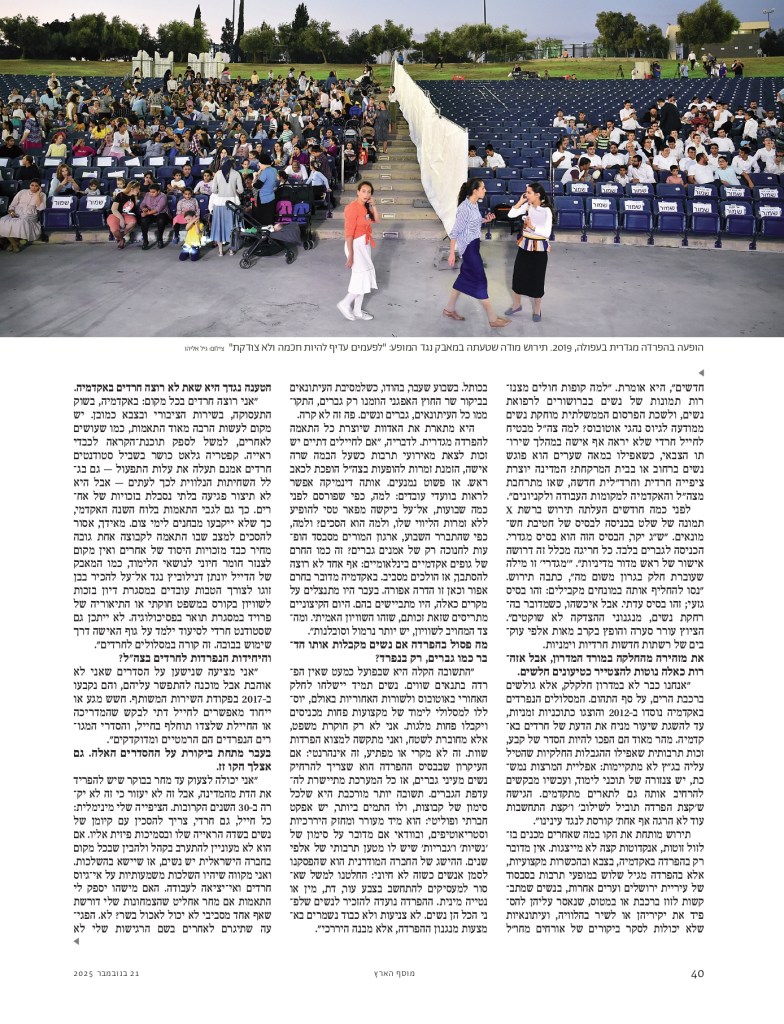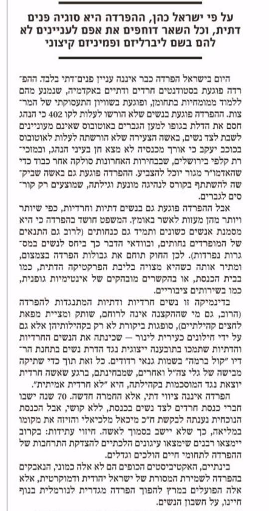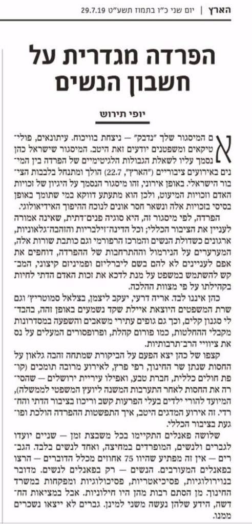 טור בעקבות הפרשה הסוערת של המחלוקת המשפטית והציבורית על המופע בהפרדה בין המינים בעפולה, יולי 2019 (לקריאה באתר ״הארץ״, כאן):