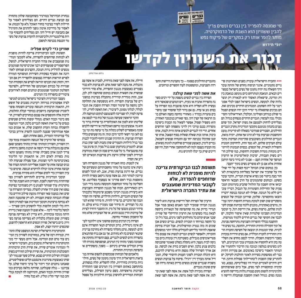 מדוע השוויון הוא השבת של הדמוקרטיה ואי אפשר להתפשר עליו כמו שלא מתפשרים על שבת אלא במקרה של פיקוח נפש (הארץ, מרץ 2018) (להאזנה לגירסת אודיו, כאן):